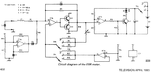 IC1d provides a half-supply voltage reference for IC1b. S1 varies IC1b's gain, changing the negative resistance to provide 0-1, 0-10 and 0-100 ESR ranges.