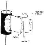Fig. 1 shows the general form of construction. The aluminium electrolytic capacitor consists of two layers of aluminium foil which are separated by paper that's impregnated with an electrolyte gel - the capacitor derives its name from this. The foil and paper sandwich is spirally wound and then enclosed in an aluminium or plastic tube.