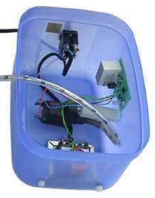 | A toggle switch rated at 250 volts was used as the on/off control. A biassed (spring-loaded) switch was used in the prototype and a waterproof cover was added to give extra insulation. | ![]() |