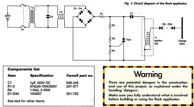 | The Circuit (see magazine) For safety, a 240:240 volt mains isolating transformer is used. This could be replaced with a 240:350 volt transformer to increase the output voltage but you would have to make other changes to compensate. The isolated AC mains voltage is full-wave rectified by diodes 1 - 4 to produce positive going sine waves at 100 Hz. Each one charges up capacitor C1 and , as the voltage reaches its peak, the thyristor switches on to discharge the capacitor through the ignition coil primary. The rapid change in current induces a voltage of around 30kV peak on the coil primary. This voltage pulse is connected via 30 diodes to a metal plate which acts as a capacitor and holds a positive charge with respect to ground. The diodes each have a reverse breakdown voltage of 1000 volts minimum. Resistor R1 limits the current flowing through the thyristor when it turns on. The resistor chain formed by R2, R3 and R4 sets the point on the sine wave when the thyristor turns on. Ideally this should be close to the peak but some allowance must be made for locations where the mains voltage is less than the nominal 230 volts. The value of R4 can be altered to change the switching point. If a 350 volt transformer is used, the value of R4 can be reduced accordingly, so that the thyristor switches closer to 340 volts than 230. Please note that resistors R1, 2 and 3 are high voltage resistors rated at 350 volts. You should use the ones specified as ordinary resistors could break down. C1 is chosen for its ability to withstand the rapid change in voltage (dv/dt). If you use a different type from the one specified, it may not survive. C2 and L2 are included to minimise the "noise" going back to the electricity supply. Neither these, nor the transformer, T2, are required for correct operation but they are essential to meet the best safety and emission requirements. (Note that they may not be sufficient to meet CE and other legislation so please do your research carefully if you plan to manufacture equipment based on this prototype. Switch S1 is a press-on release-off type for safety. This ensures that you always have one hand on the switch while the unit is running. The switch has an insulating plastic cover fitted. | |