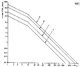 Fig. 6: Typical ESR values, A 10V normal grade, B 25V normal or 10V low-ESR grade, C 100V normal or 25V low-ESR grade, D 63V low-ESR grade.
